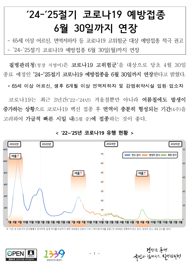 고위험군을 대상으로 한 코로나19 무료 예방접종이 2025년 6월 30일까지 연장되었다는 소식입니다.