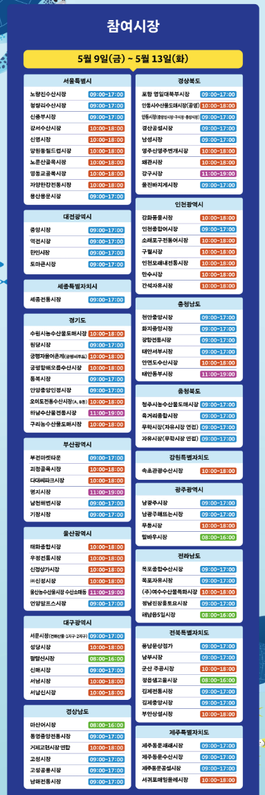 단, 시장별 휴무일에 따라 운영 일정이 다를 수 있으므로 방문 전 해당 시장 홈페이지 또는 전화로 사전 확인 필수