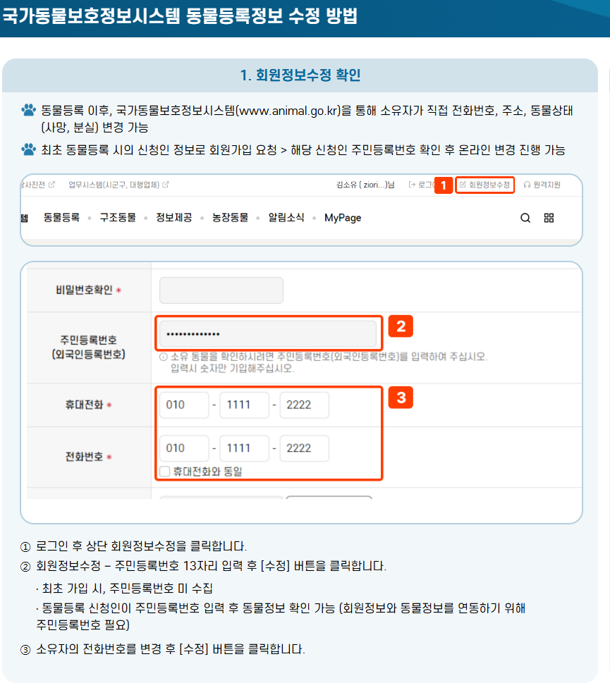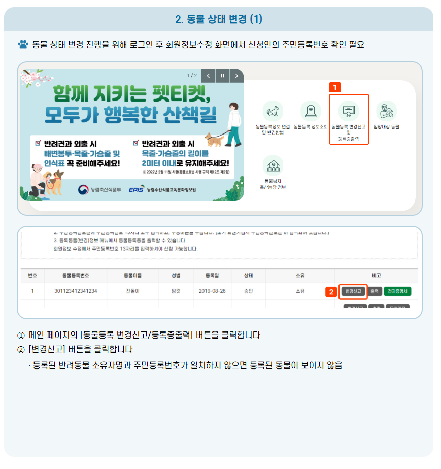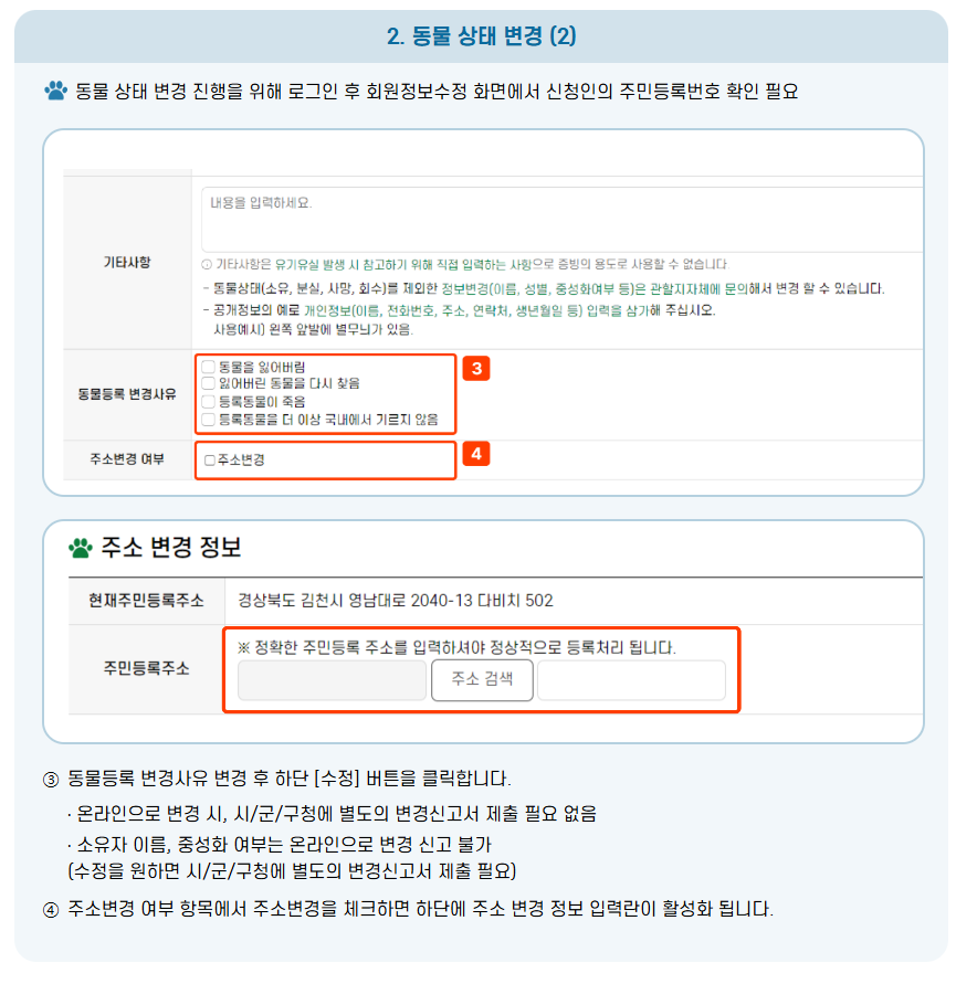 - 등록 정보 변경 (소유자 변경, 주소 이전, 반려견 사망 등)