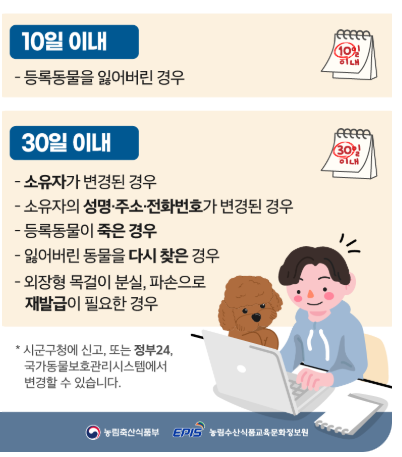 반려견 등록 후에도 다음과 같은 변경 사항이 발생하면 30일 이내에 반드시 지자체에 신고해야 합니다.