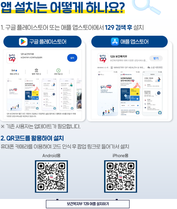 국번없이 129, 긴급복지, 복지지원, 자살, 알콜중독 등 복지 상담 서비스 제공